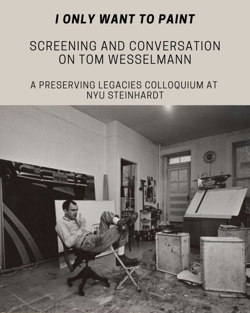 Join us for “I Only Want to Paint Screening and Conversation on Tom Wesselmann,” a Preserving Legacies Colloquium at NYU Steinhardt, with Susan Davidson (author of Tom Wesselmann: The Great American Nude), Jeffrey Sturges (Director of Exhibitions, The Estate of Tom Wesselmann) and Huffa Frobes-Cross (Tom Wesselmann Catalogue Raisonné Project Manager, WPI). Following a screening of Klaus Benden’s documentary I Only Want to Paint, we will consider examples from the more extensive cache of audio footage recorded during the filming to discuss Wesselmann’s processes, his artistic influences, and legacy.